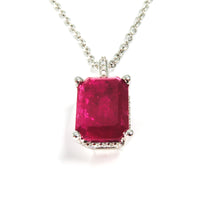 A striking emerald-cut ruby weighing 5.14 carats is the centerpiece of this elegant pendant, set in 14K white gold and accented by 0.12 carats of sparkling diamonds. The clean lines of the emerald cut highlight the ruby’s rich red hue, while a delicate diamond halo and diamond-set bail add refined brilliance.