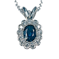 Elegant 14K white gold necklace featuring an oval blue sapphire center surrounded by a sparkling diamond halo. A timeless and sophisticated design perfect for everyday wear or special occasions.