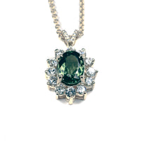 Elegant and vibrant, this 14K yellow gold necklace features a 1.85 carat oval green tourmaline framed by a sparkling diamond halo totaling approximately 0.90 carats. The rich green center stone is beautifully complemented by the brilliance of round diamonds, creating a timeless and eye-catching design. Suspended from a classic yellow gold chain, this necklace offers a refined balance of color and sparkle, perfect for both everyday luxury and special occasions.